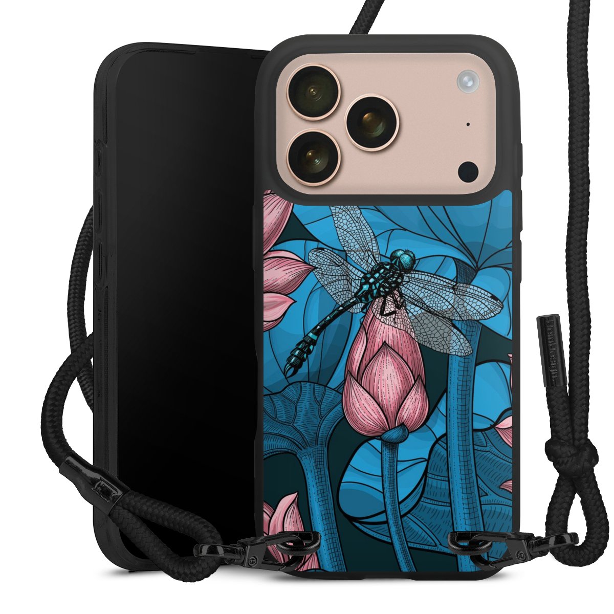 Pure Black: Handyhülle, Stoffband und Metalldetails in stylischem Mattschwarz.