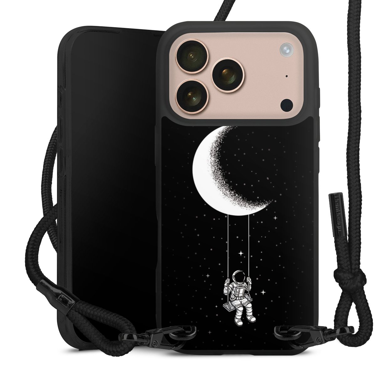 Pure Black: Handyhülle, Stoffband und Metalldetails in stylischem Mattschwarz.