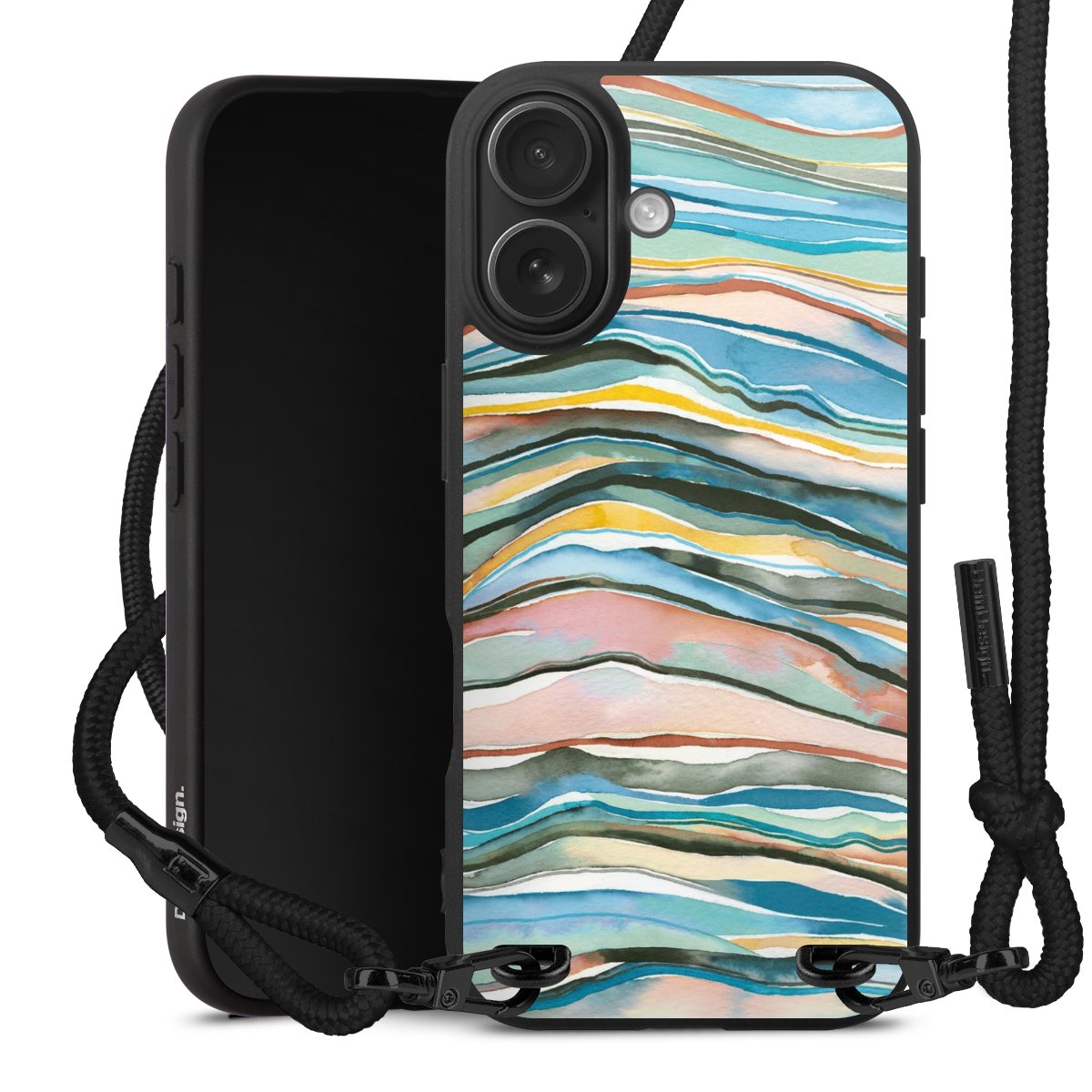 Pure Black: Handyhülle, Stoffband und Metalldetails in stylischem Mattschwarz.