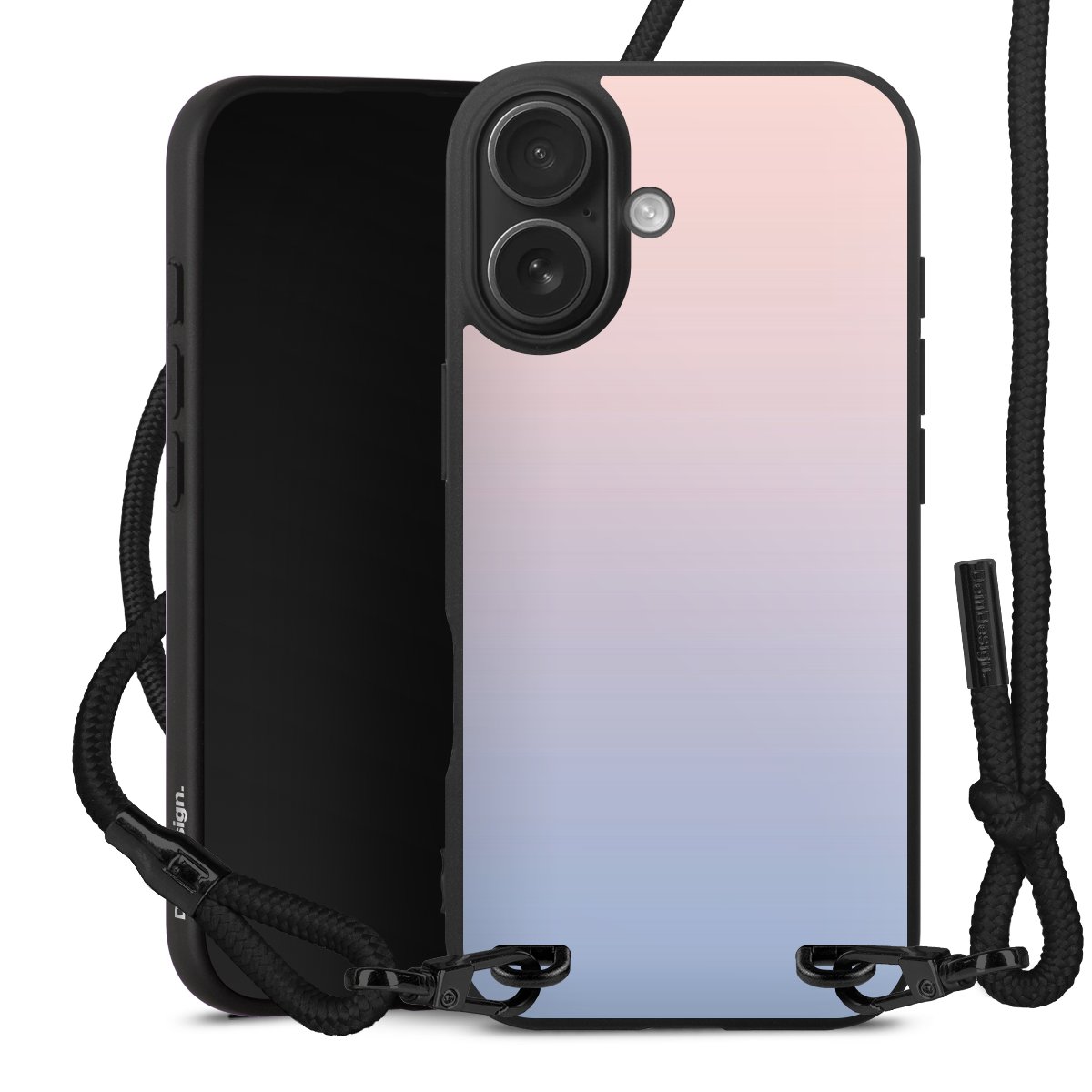 Pure Black: Handyhülle, Stoffband und Metalldetails in stylischem Mattschwarz.