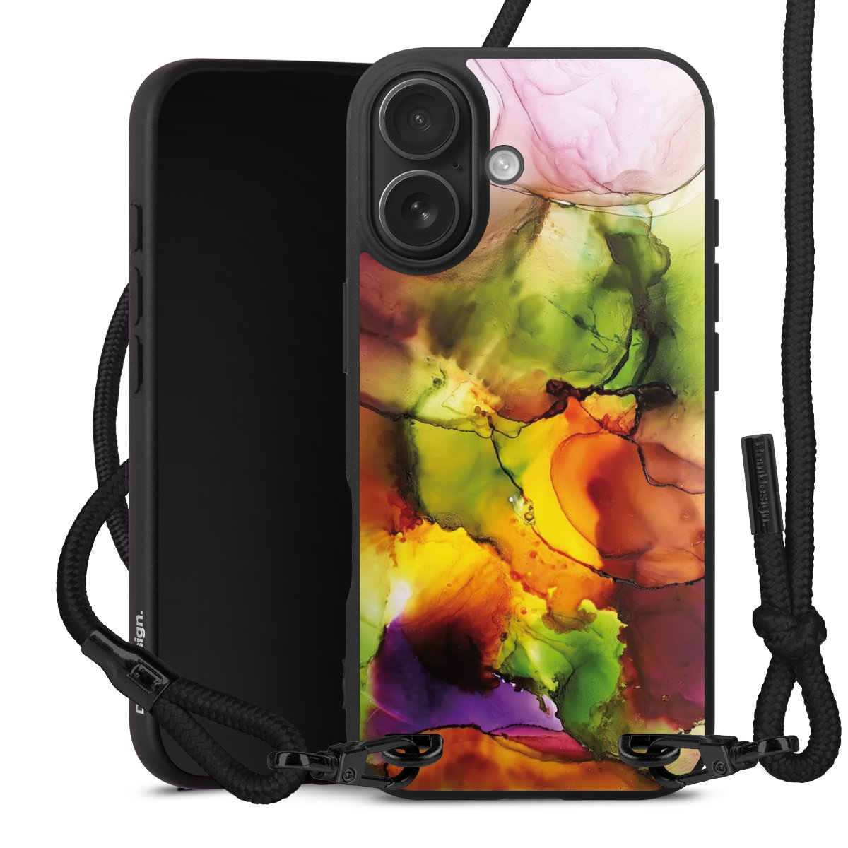 Pure Black: Handyhülle, Stoffband und Metalldetails in stylischem Mattschwarz.
