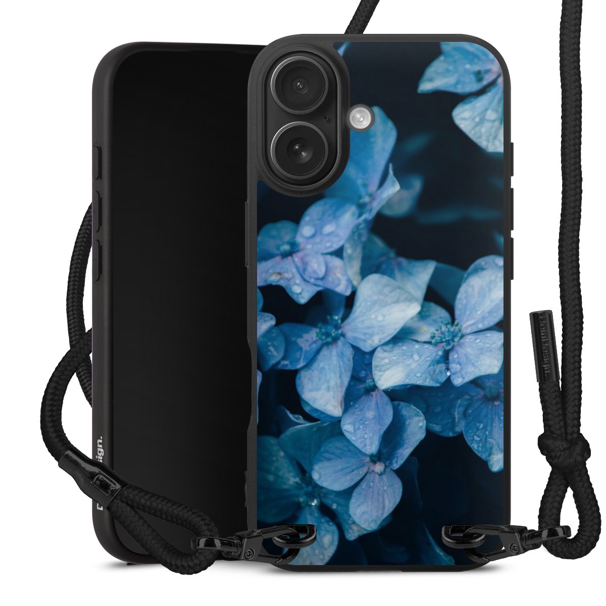 Pure Black: Handyhülle, Stoffband und Metalldetails in stylischem Mattschwarz.