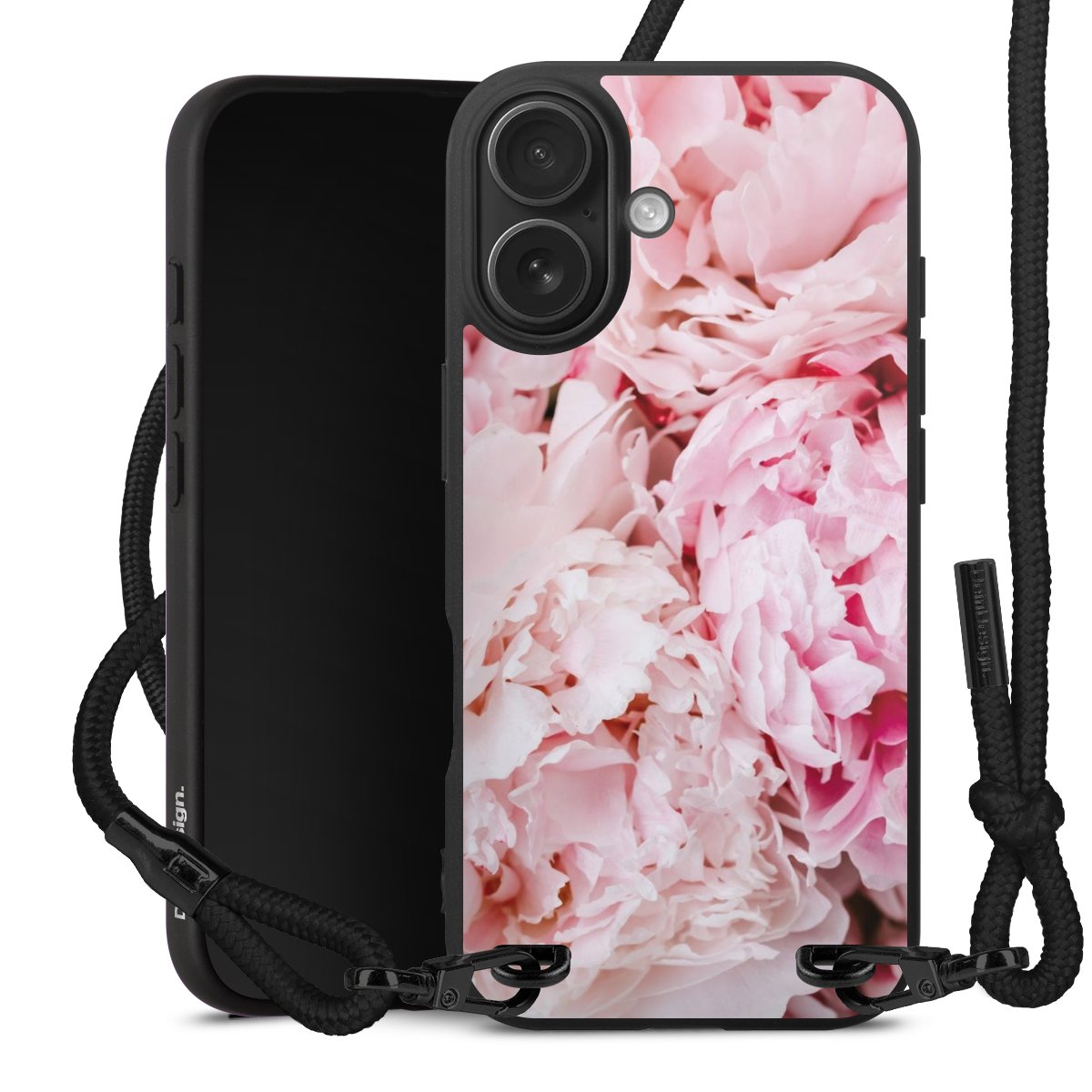 Pure Black: Handyhülle, Stoffband und Metalldetails in stylischem Mattschwarz.
