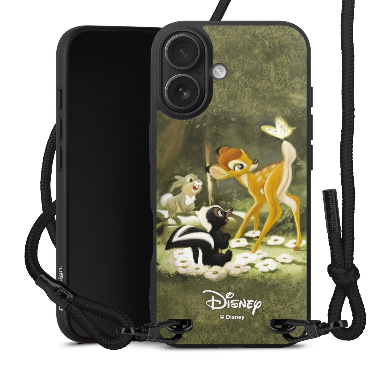 Pure Black: Handyhülle, Stoffband und Metalldetails in stylischem Mattschwarz.
