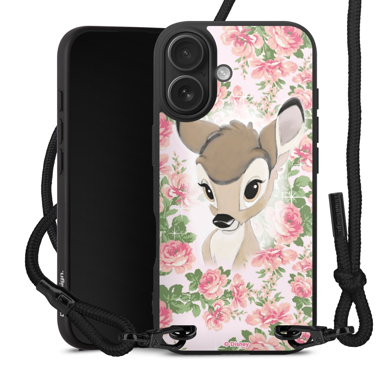 Pure Black: Handyhülle, Stoffband und Metalldetails in stylischem Mattschwarz.
