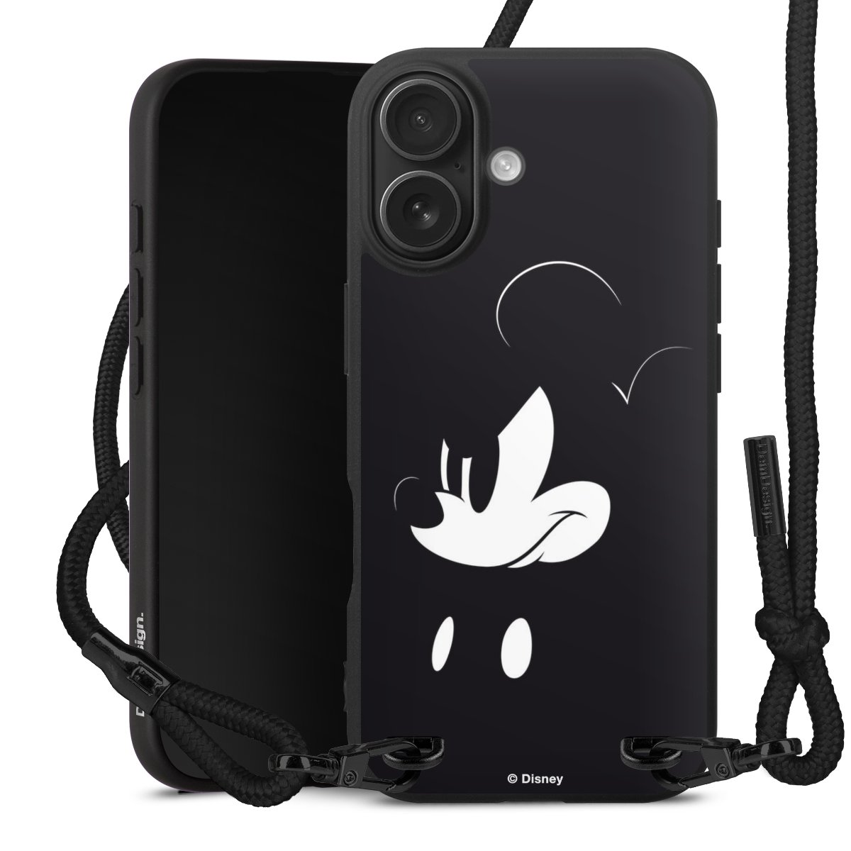 Pure Black: Handyhülle, Stoffband und Metalldetails in stylischem Mattschwarz.