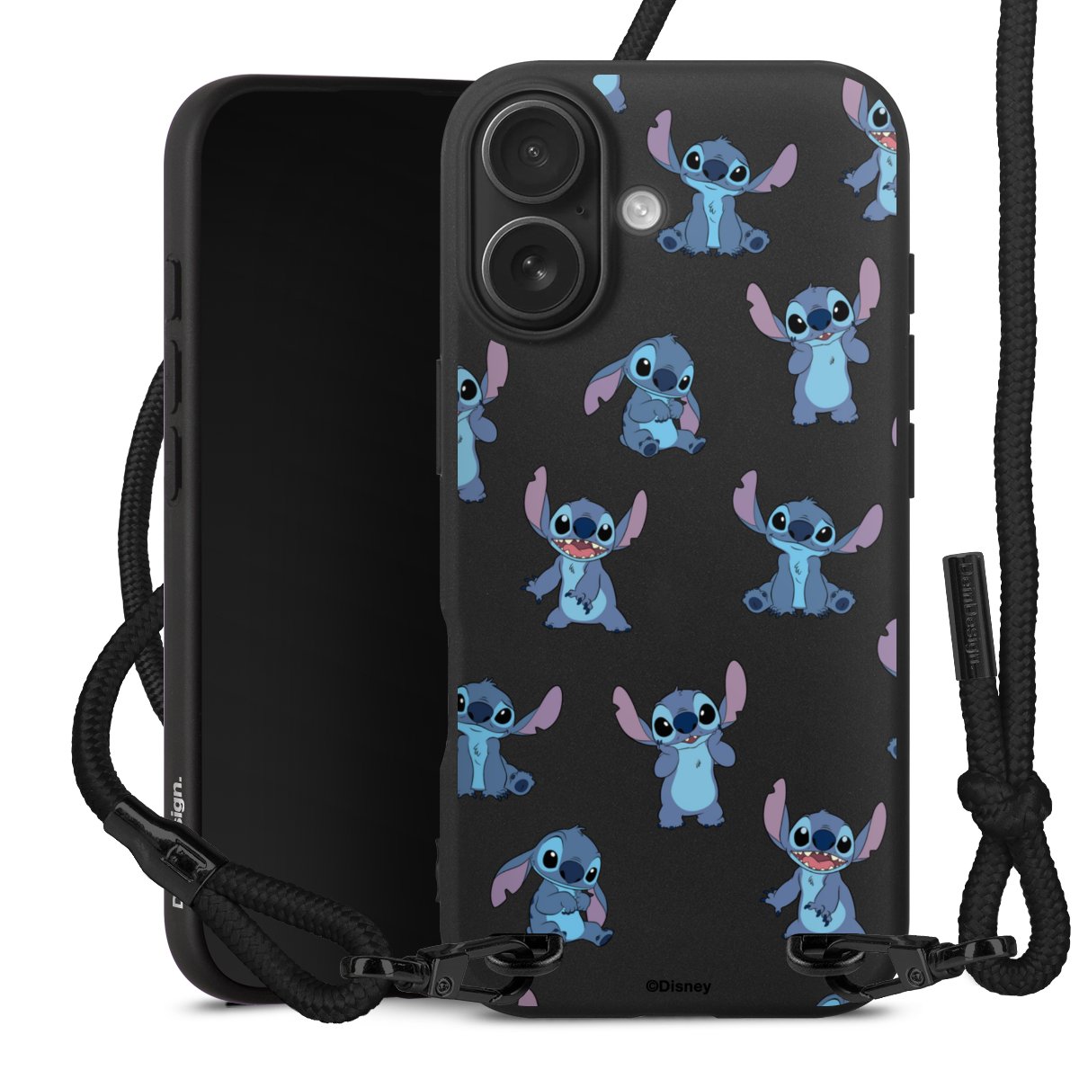 Pure Black: Handyhülle, Stoffband und Metalldetails in stylischem Mattschwarz.