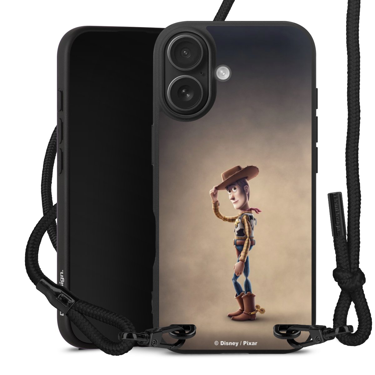 Pure Black: Handyhülle, Stoffband und Metalldetails in stylischem Mattschwarz.