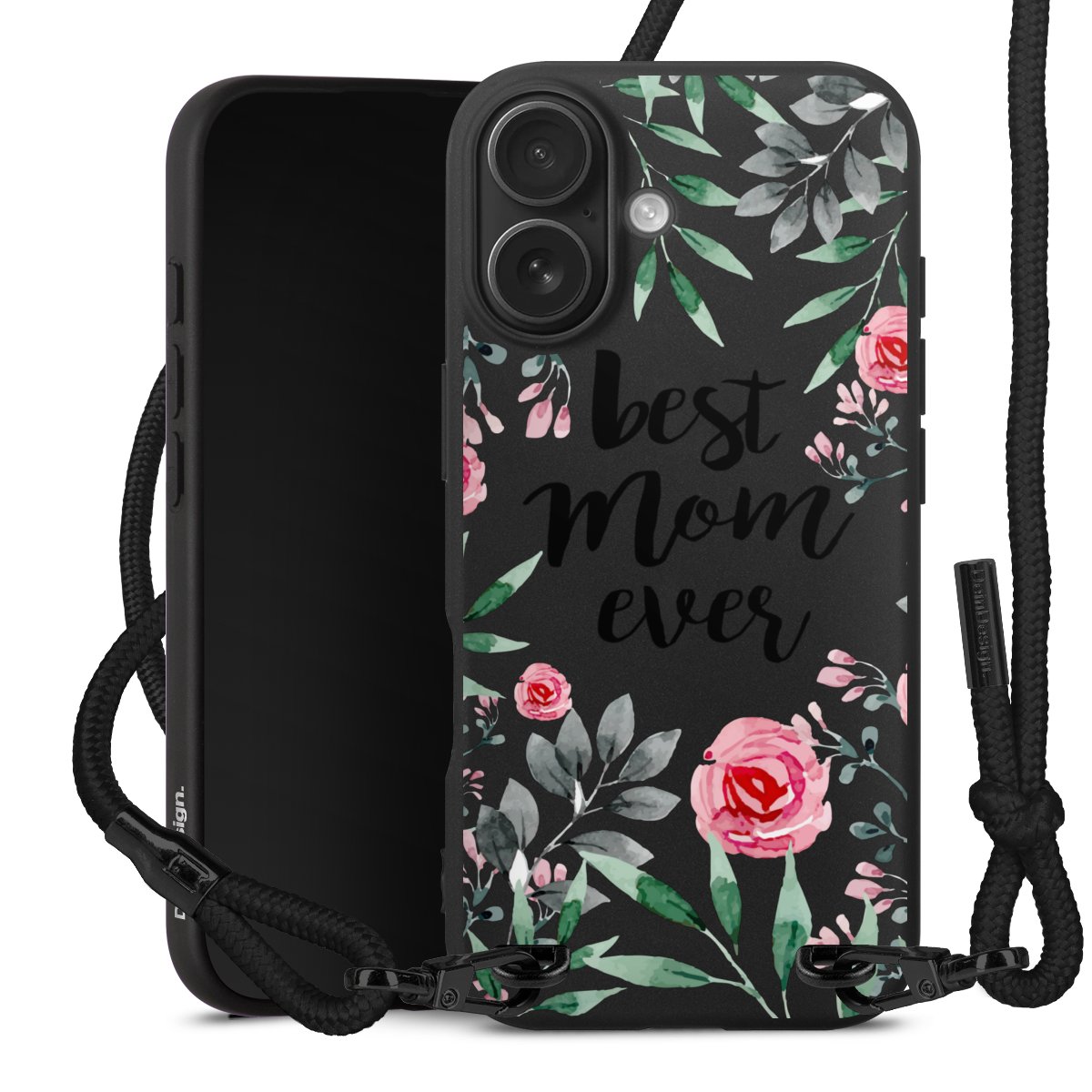 Pure Black: Handyhülle, Stoffband und Metalldetails in stylischem Mattschwarz.