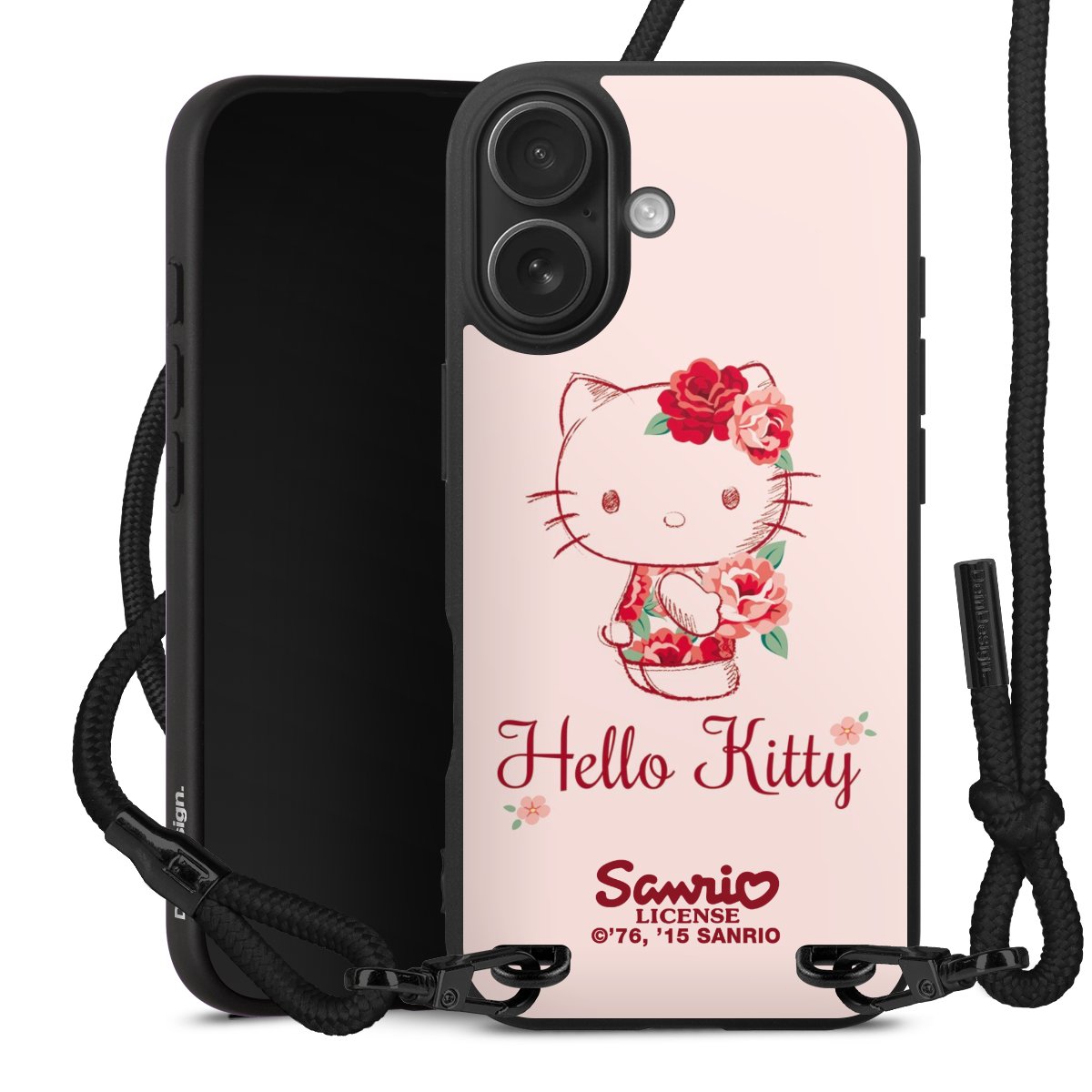 Pure Black: Handyhülle, Stoffband und Metalldetails in stylischem Mattschwarz.
