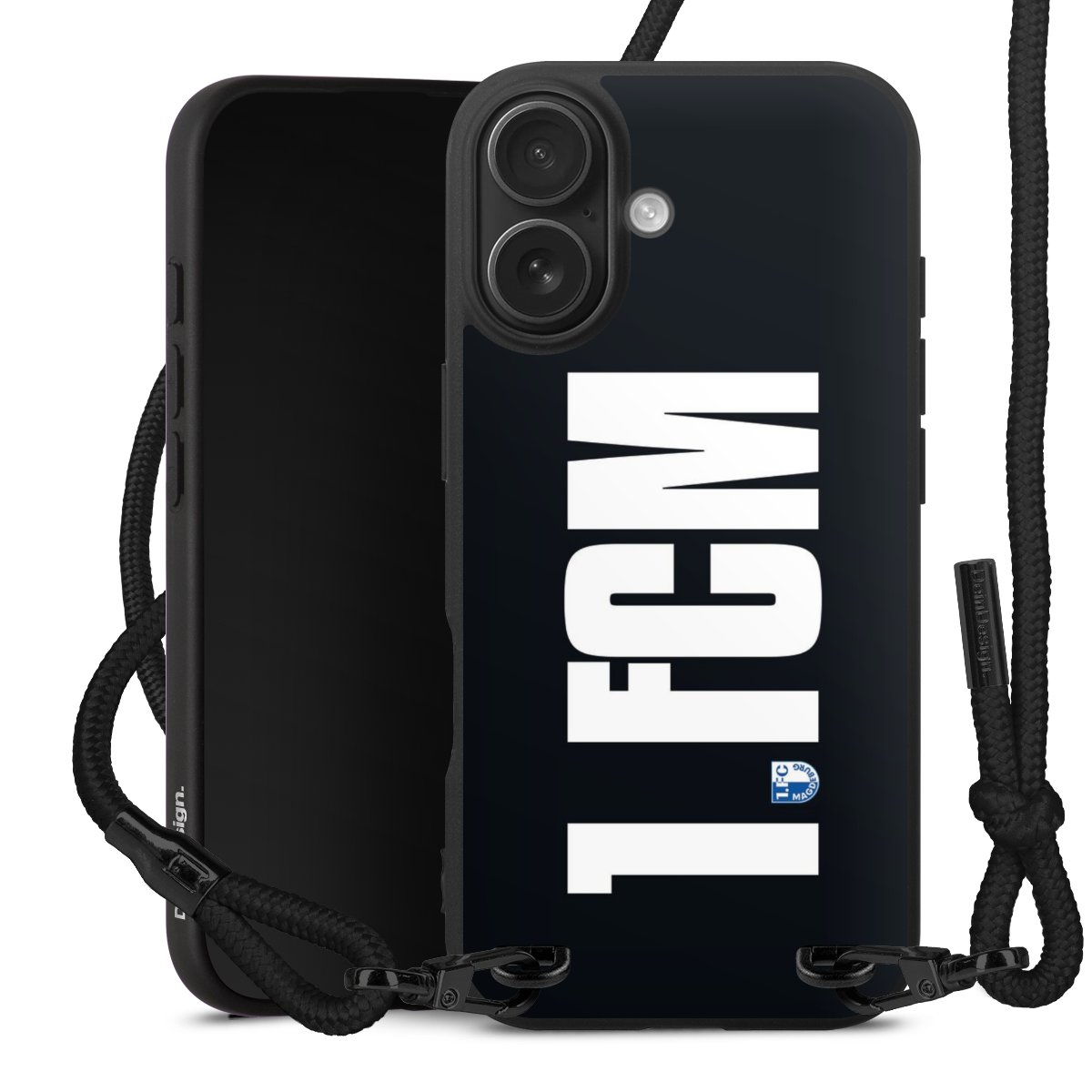 Pure Black: Handyhülle, Stoffband und Metalldetails in stylischem Mattschwarz.