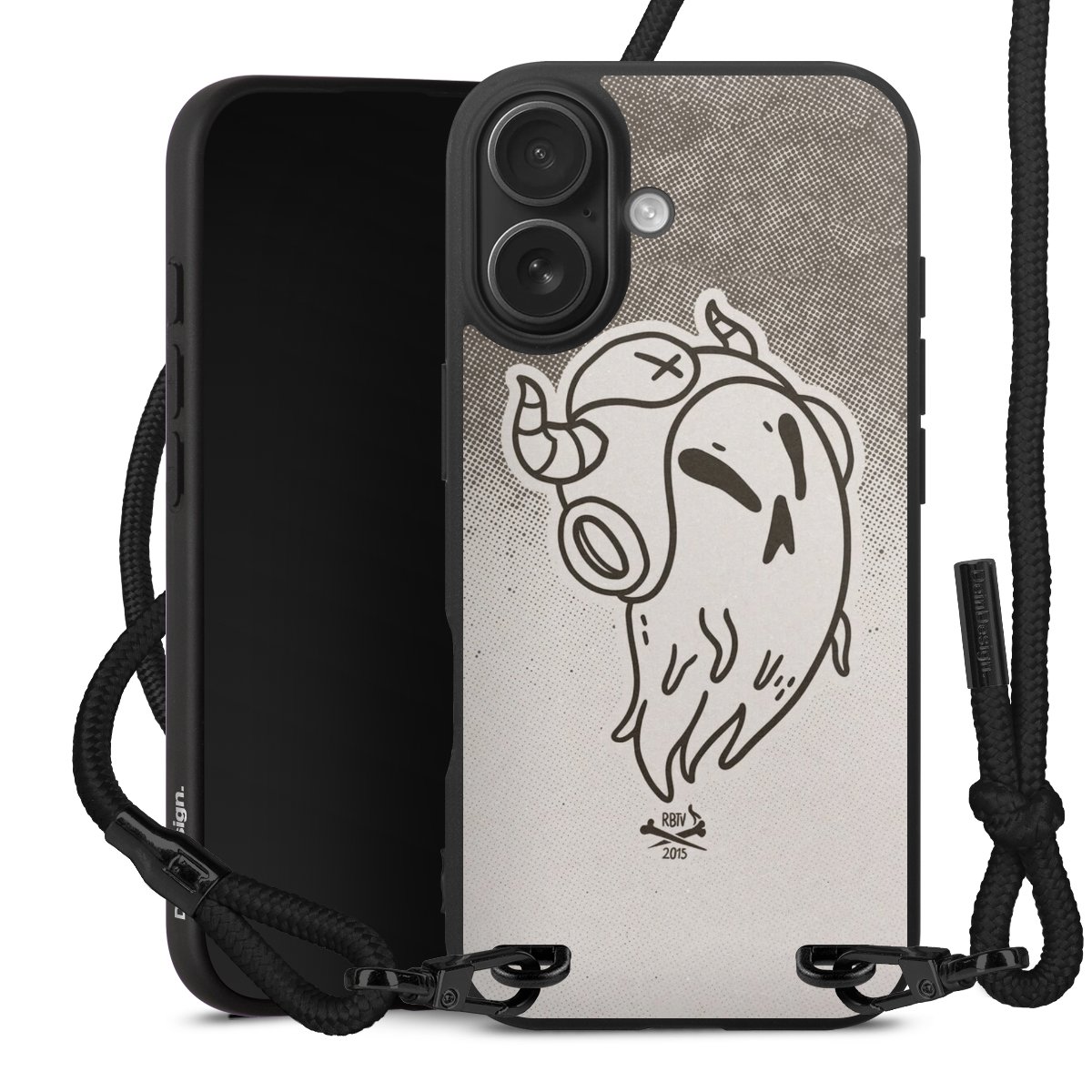 Pure Black: Handyhülle, Stoffband und Metalldetails in stylischem Mattschwarz.
