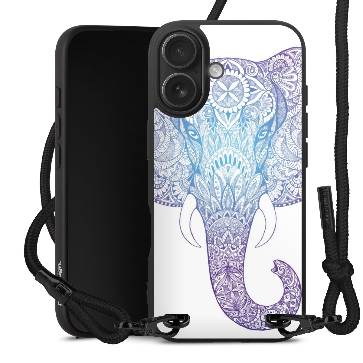 Pure Black: Handyhülle, Stoffband und Metalldetails in stylischem Mattschwarz.