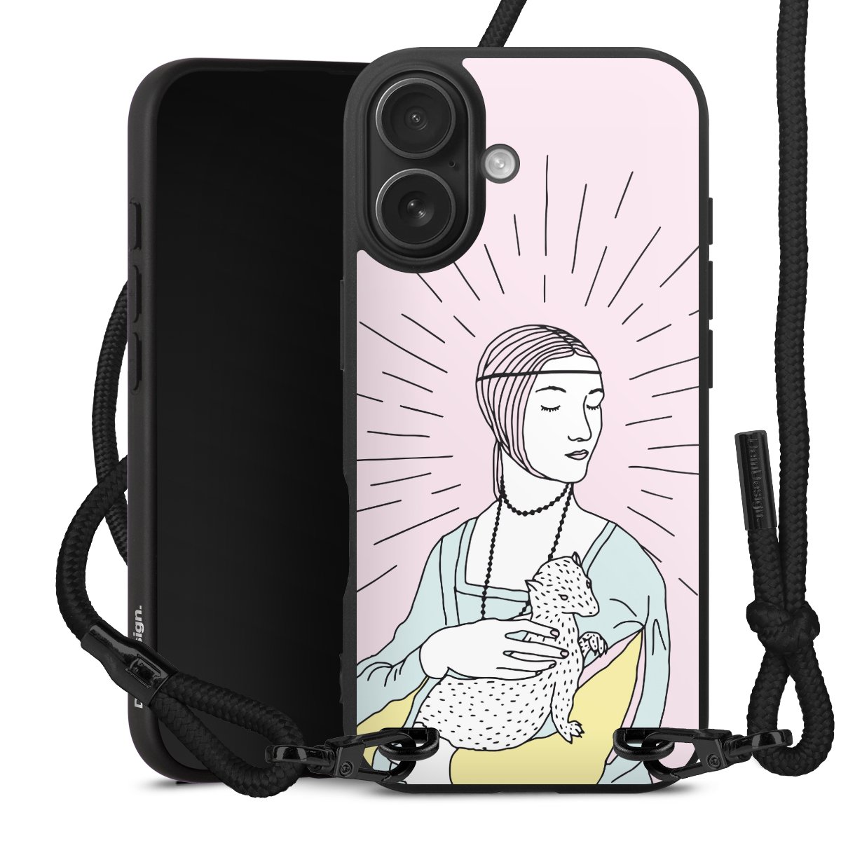 Pure Black: Handyhülle, Stoffband und Metalldetails in stylischem Mattschwarz.