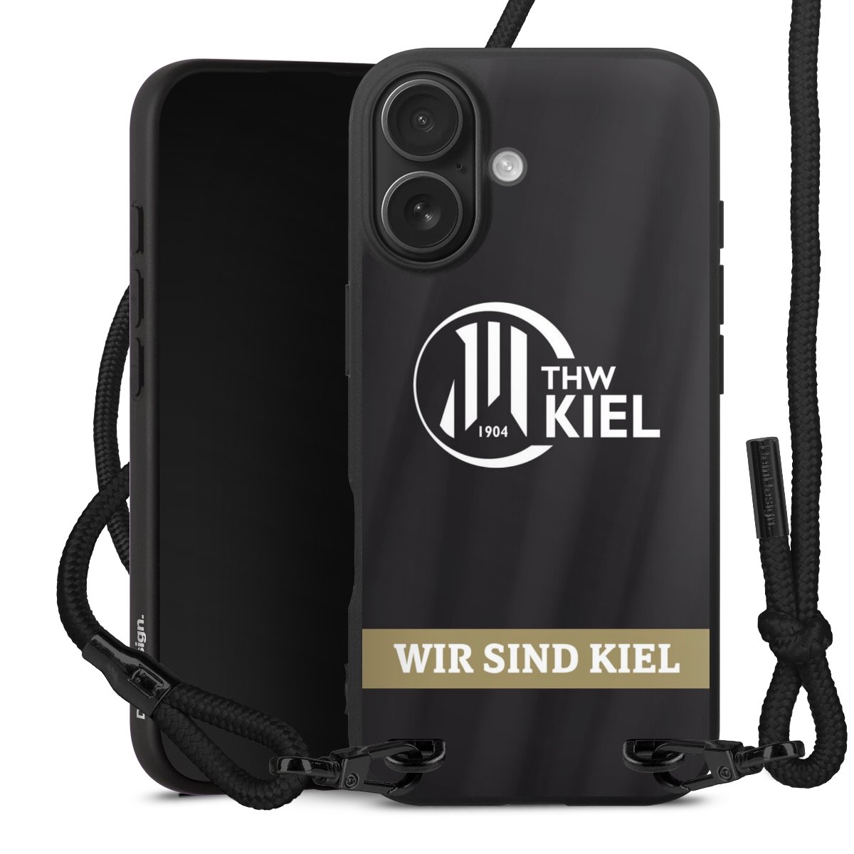 Pure Black: Handyhülle, Stoffband und Metalldetails in stylischem Mattschwarz.
