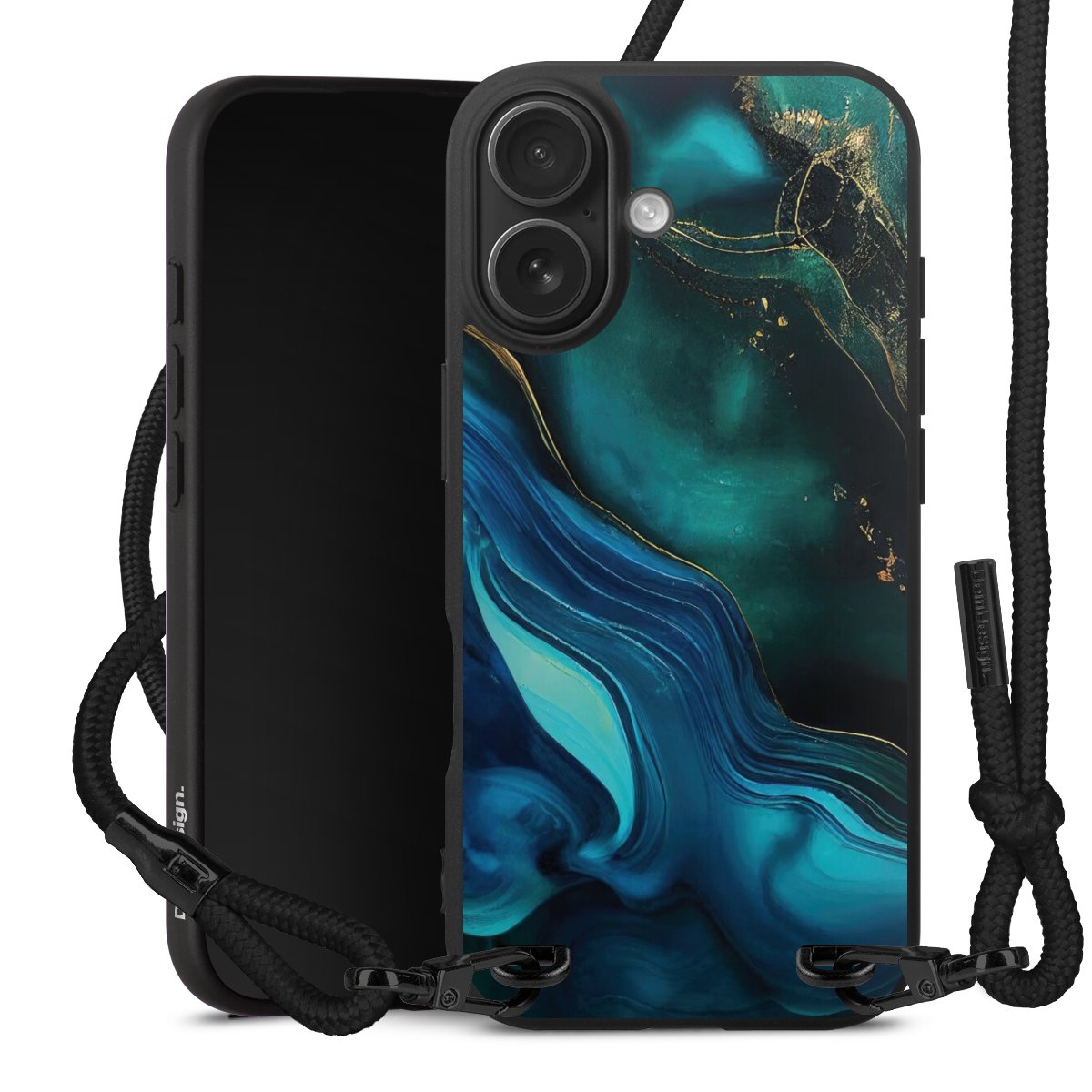 Pure Black: Handyhülle, Stoffband und Metalldetails in stylischem Mattschwarz.