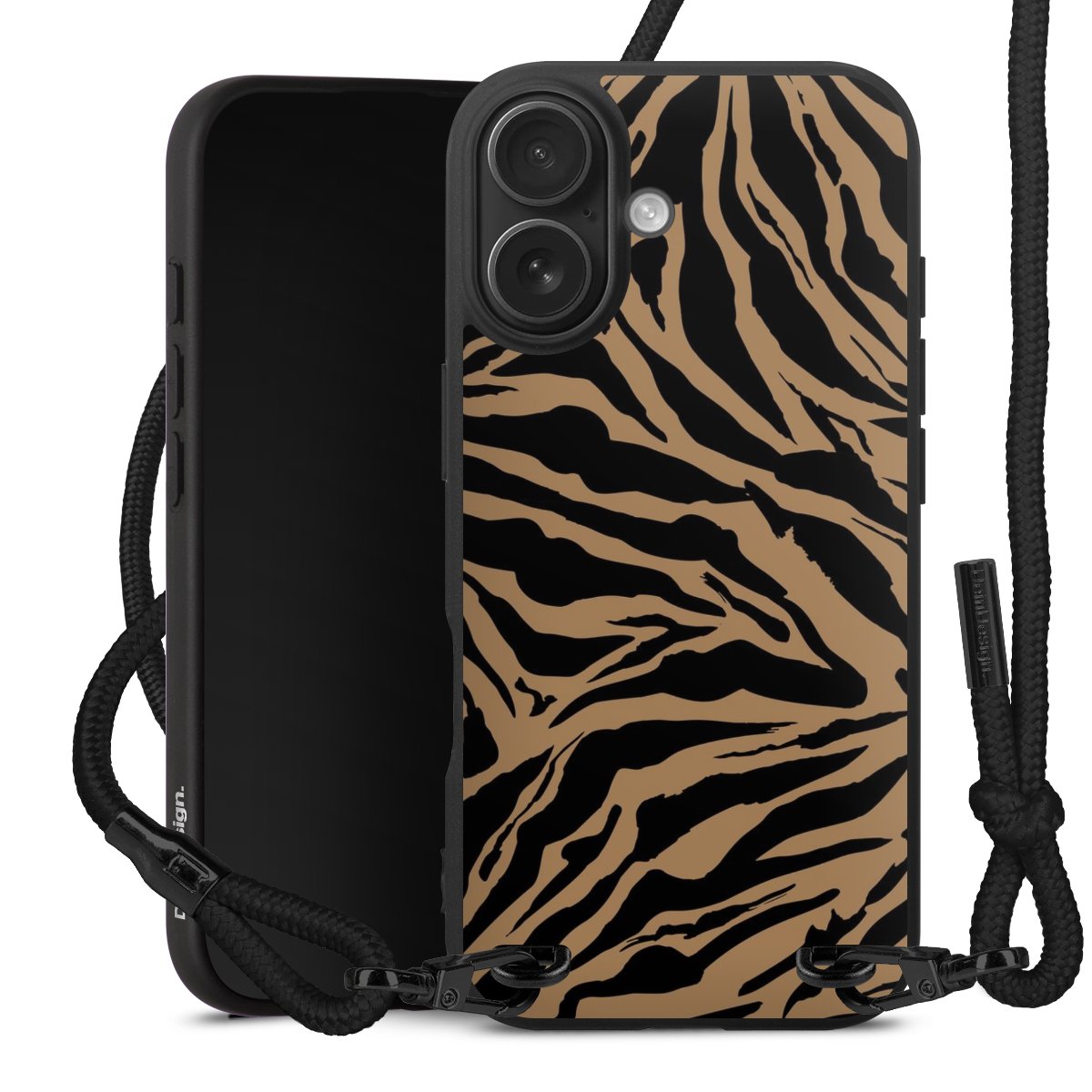 Pure Black: Handyhülle, Stoffband und Metalldetails in stylischem Mattschwarz.