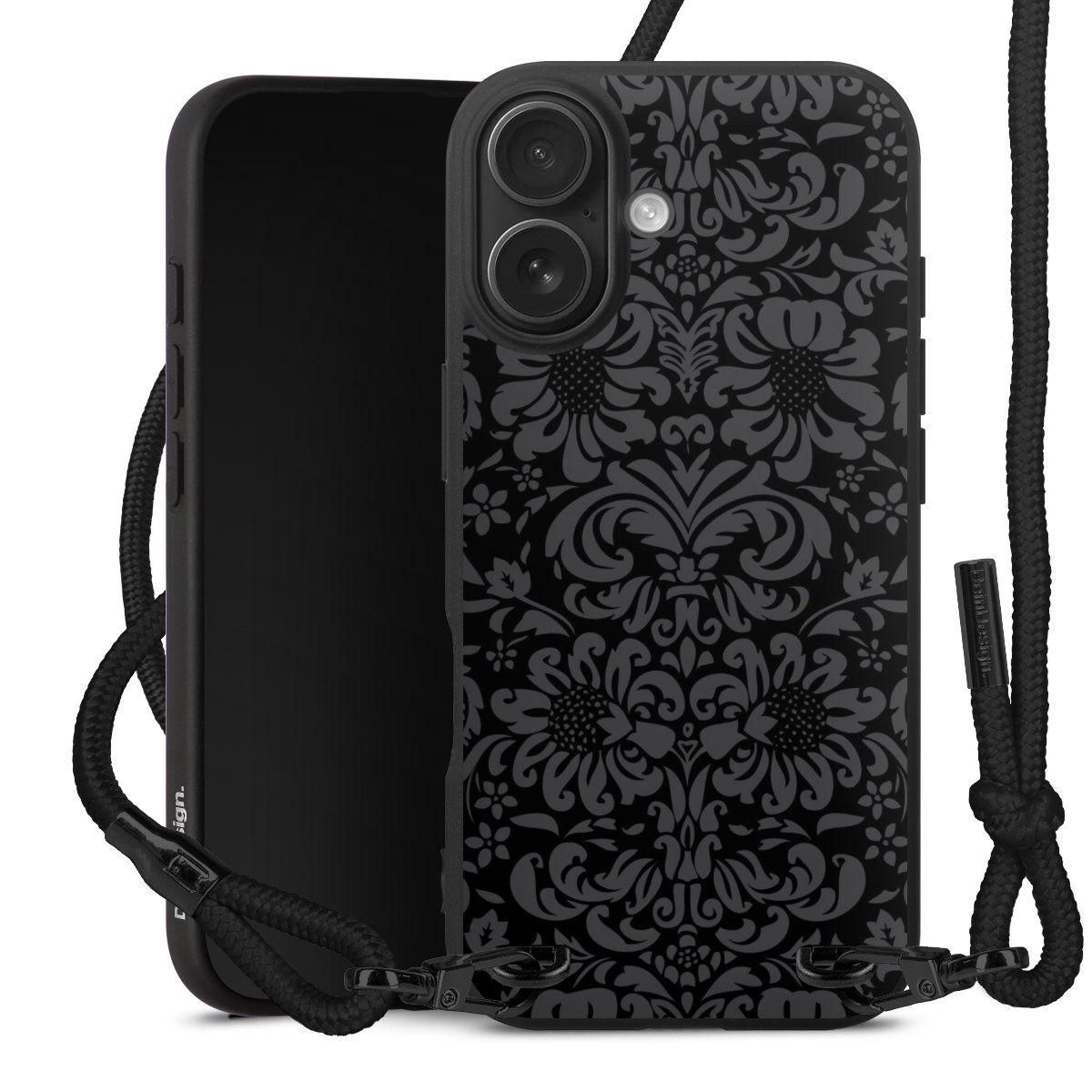 Pure Black: Handyhülle, Stoffband und Metalldetails in stylischem Mattschwarz.
