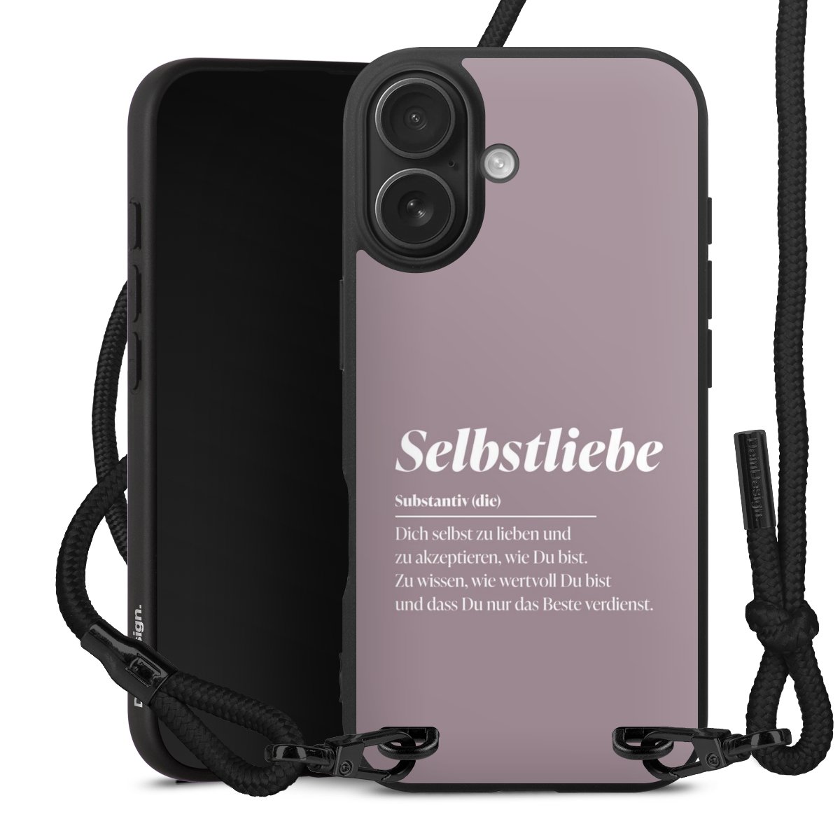Pure Black: Handyhülle, Stoffband und Metalldetails in stylischem Mattschwarz.