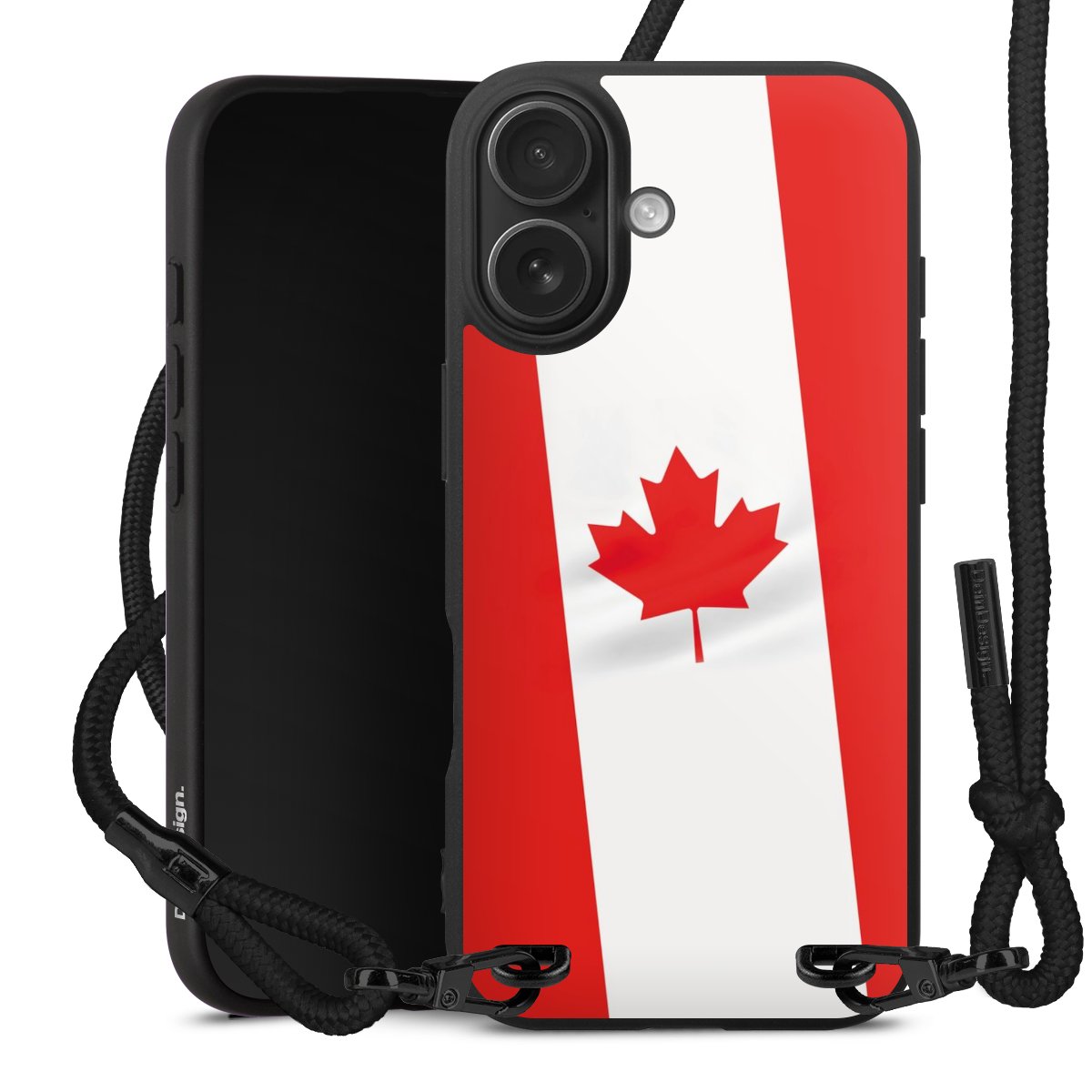 Pure Black: Handyhülle, Stoffband und Metalldetails in stylischem Mattschwarz.