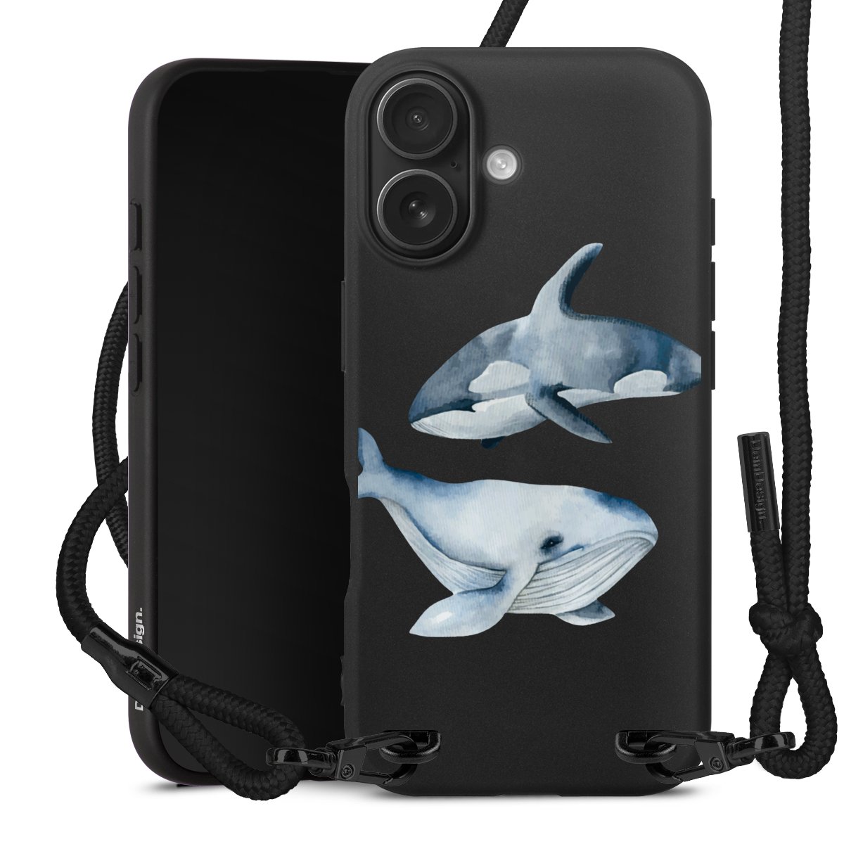 Pure Black: Handyhülle, Stoffband und Metalldetails in stylischem Mattschwarz.