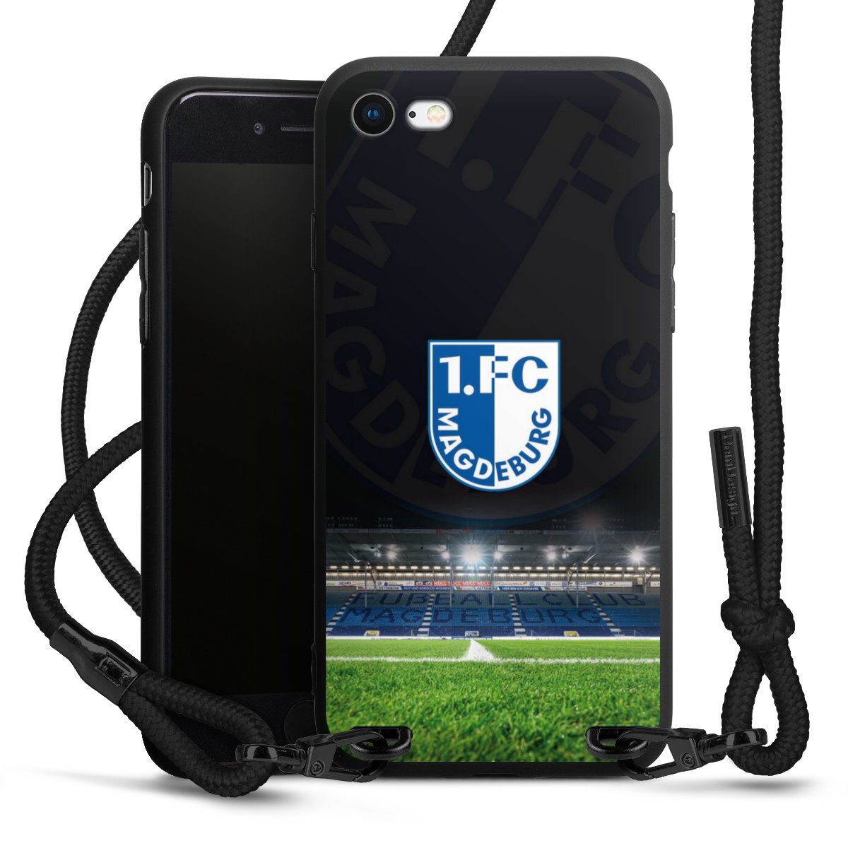 Pure Black: Handyhülle, Stoffband und Metalldetails in stylischem Mattschwarz.