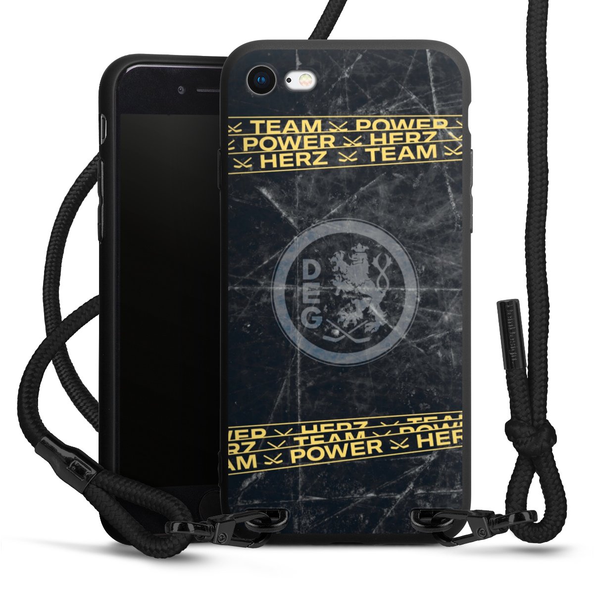 Pure Black: Handyhülle, Stoffband und Metalldetails in stylischem Mattschwarz.