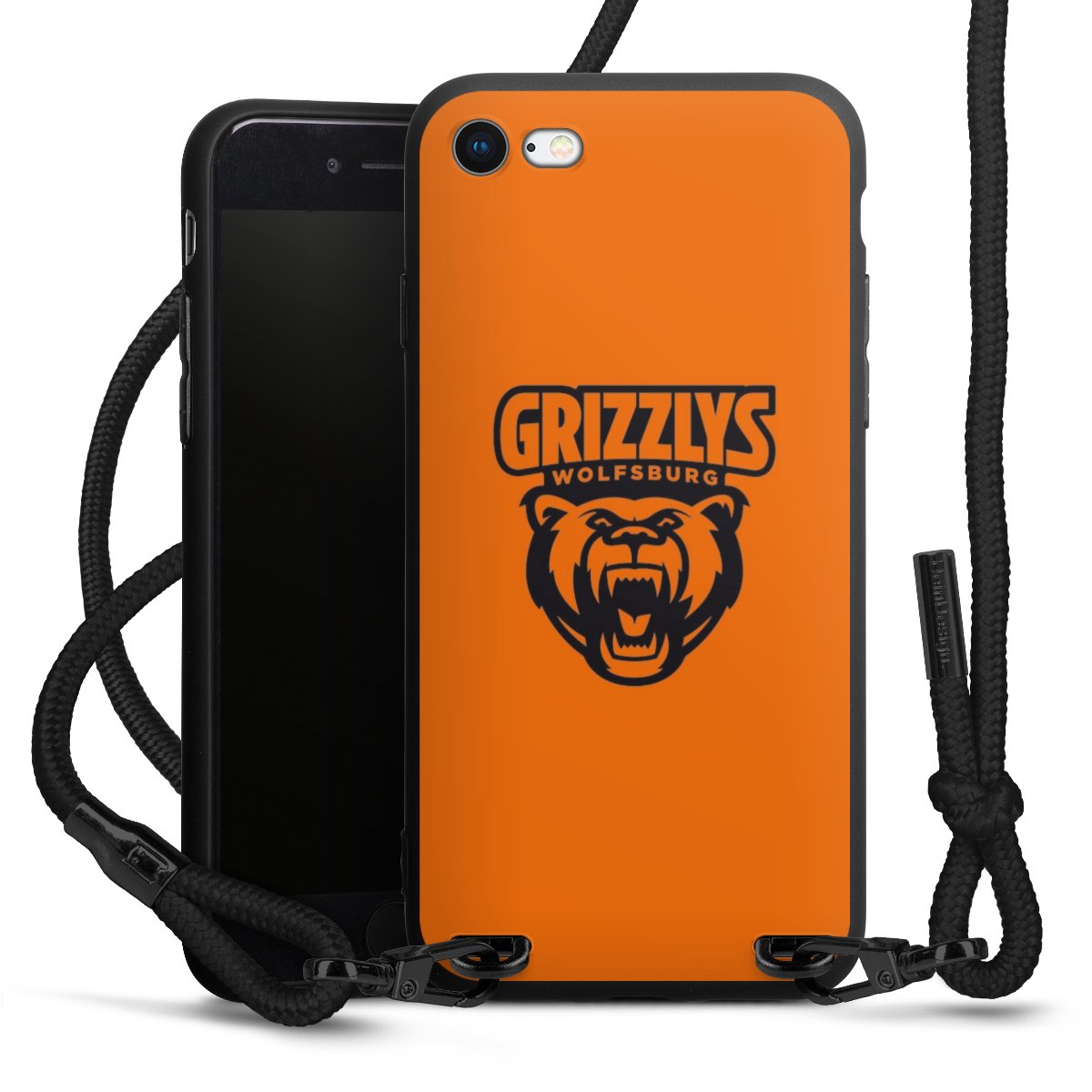 Pure Black: Handyhülle, Stoffband und Metalldetails in stylischem Mattschwarz.