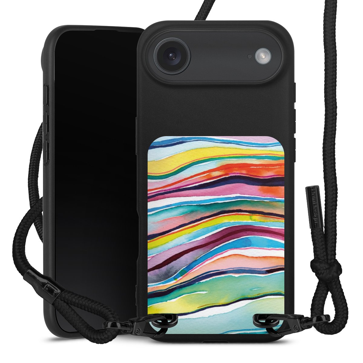 Pure Black: Handyhülle, Stoffband und Metalldetails in stylischem Mattschwarz.