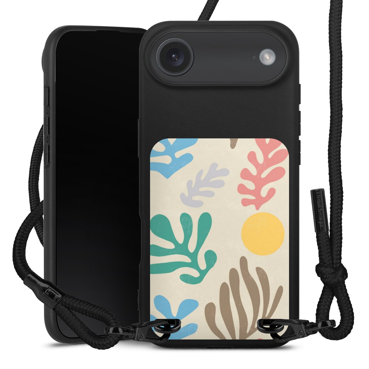 Pure Black: Handyhülle, Stoffband und Metalldetails in stylischem Mattschwarz.