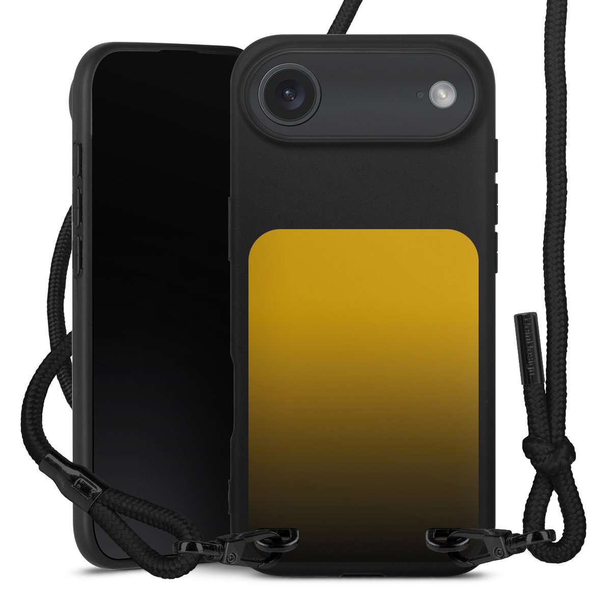 Pure Black: Handyhülle, Stoffband und Metalldetails in stylischem Mattschwarz.