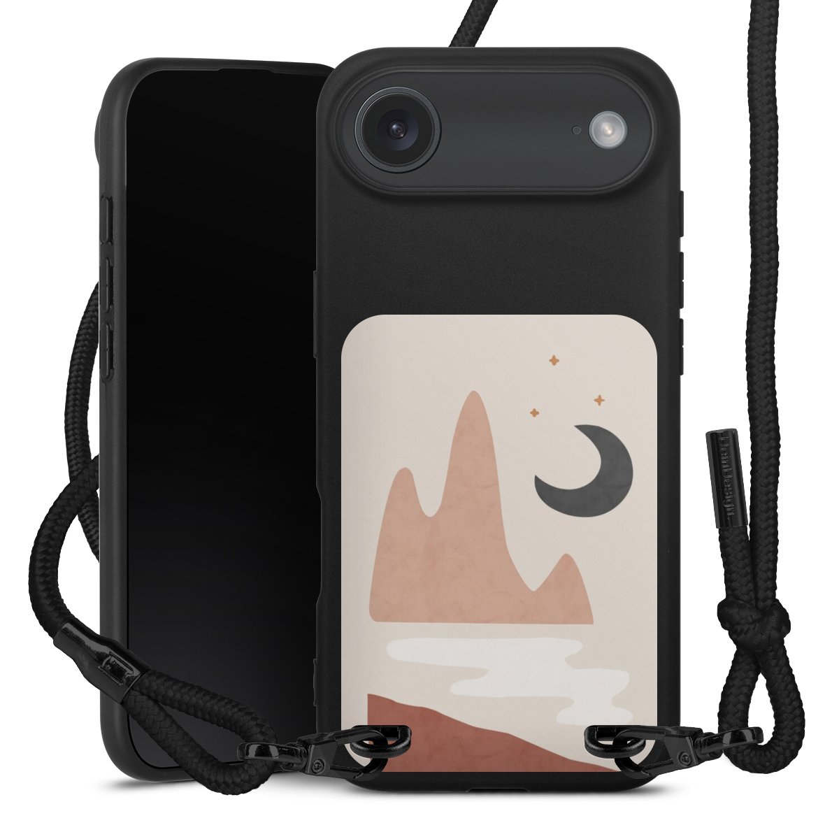 Pure Black: Handyhülle, Stoffband und Metalldetails in stylischem Mattschwarz.