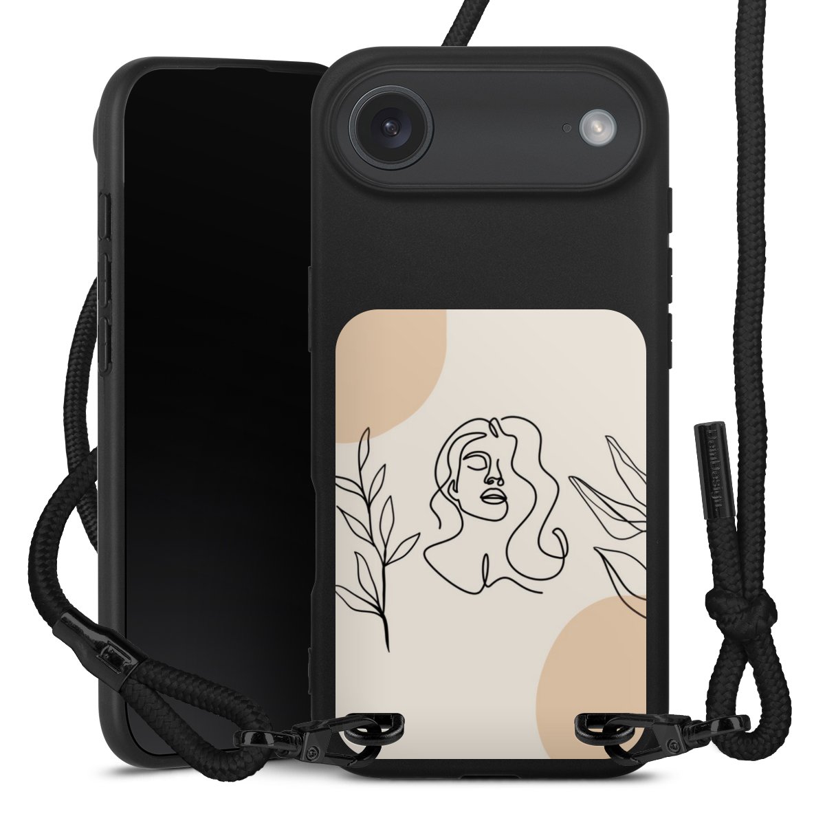 Pure Black: Handyhülle, Stoffband und Metalldetails in stylischem Mattschwarz.