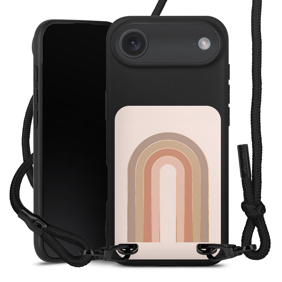 Pure Black: Handyhülle, Stoffband und Metalldetails in stylischem Mattschwarz.