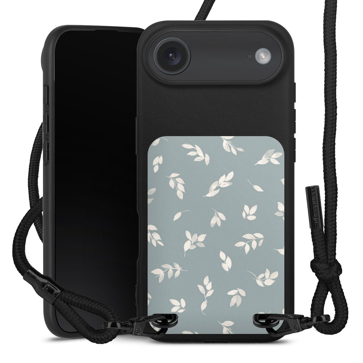 Pure Black: Handyhülle, Stoffband und Metalldetails in stylischem Mattschwarz.