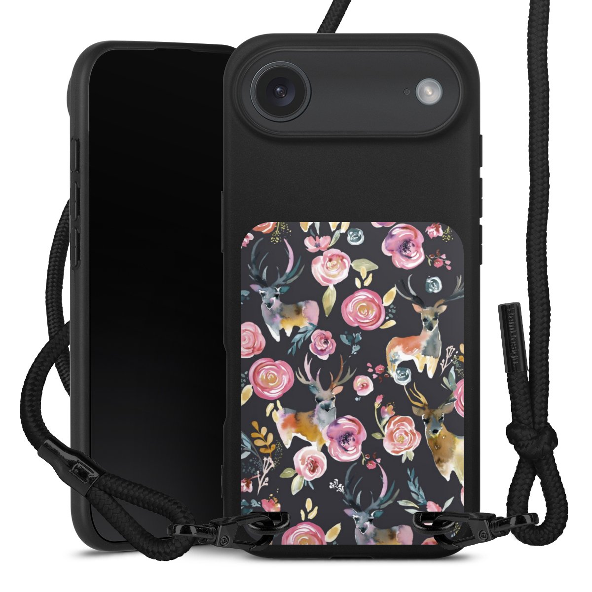 Pure Black: Handyhülle, Stoffband und Metalldetails in stylischem Mattschwarz.