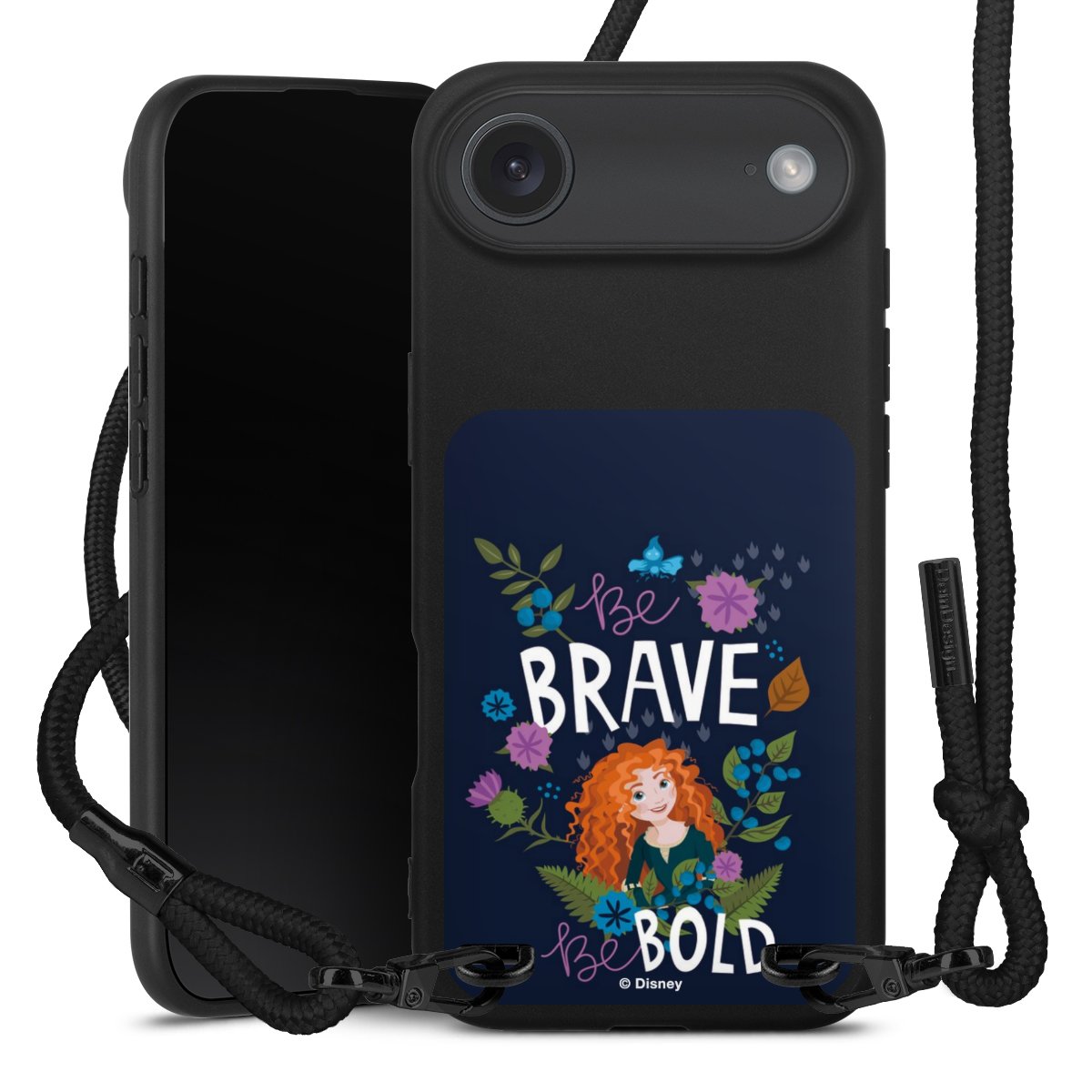 Pure Black: Handyhülle, Stoffband und Metalldetails in stylischem Mattschwarz.