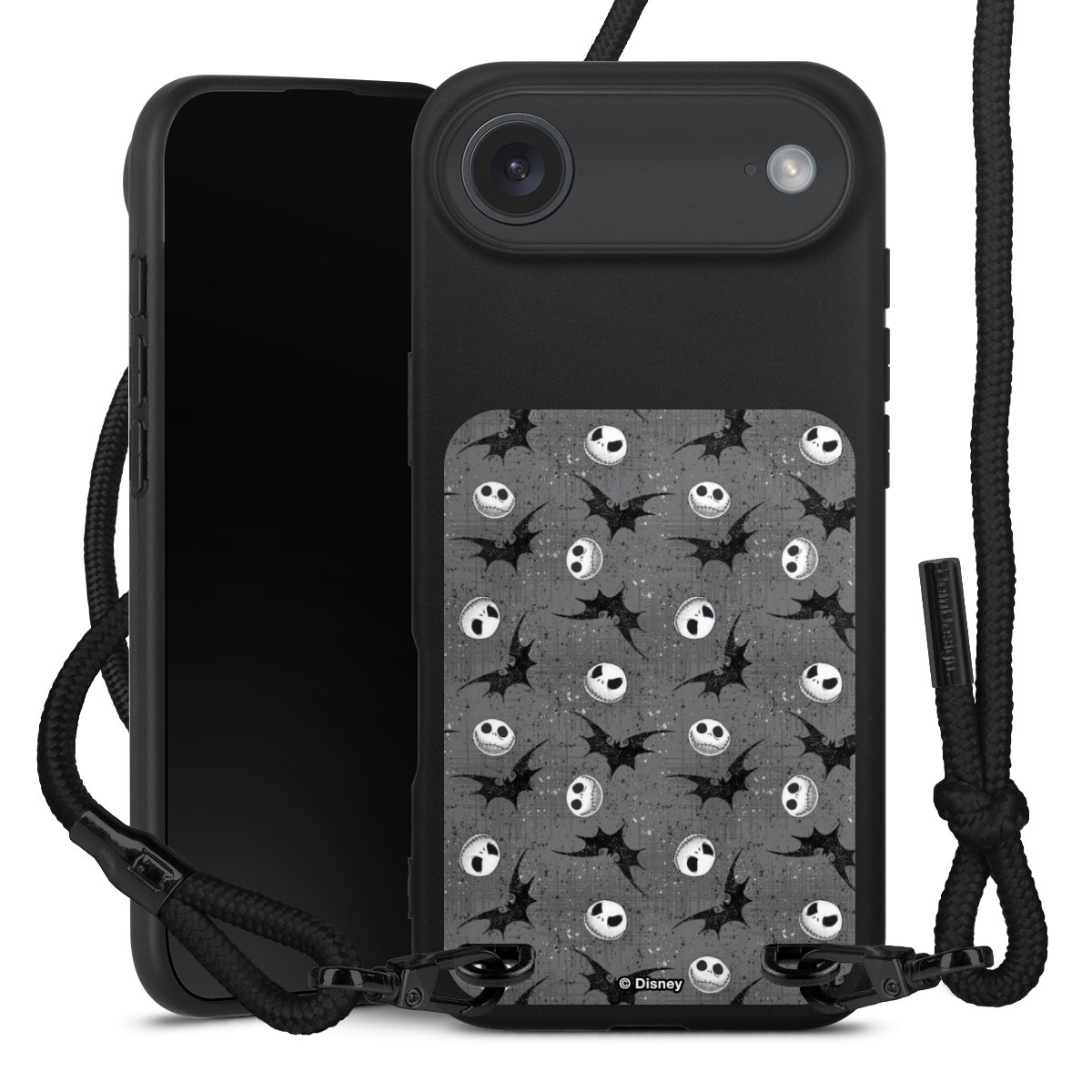 Pure Black: Handyhülle, Stoffband und Metalldetails in stylischem Mattschwarz.