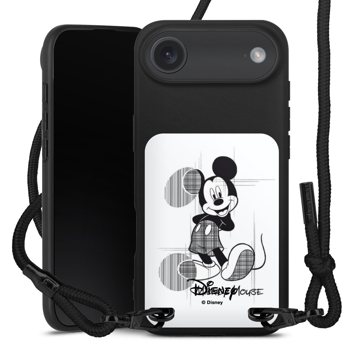 Pure Black: Handyhülle, Stoffband und Metalldetails in stylischem Mattschwarz.