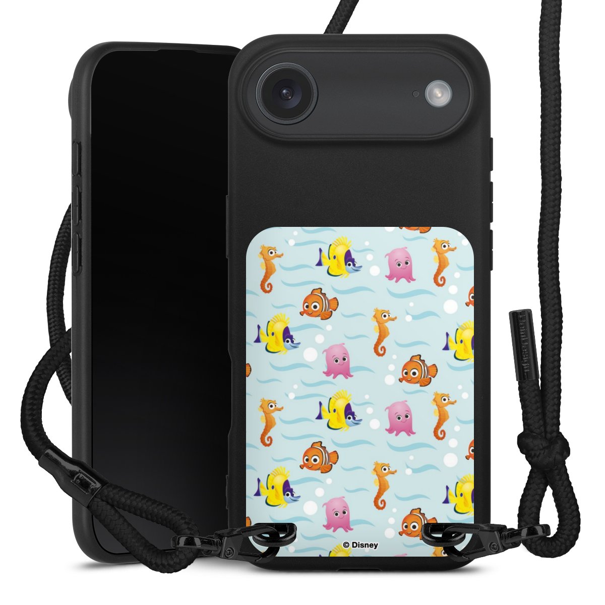 Pure Black: Handyhülle, Stoffband und Metalldetails in stylischem Mattschwarz.