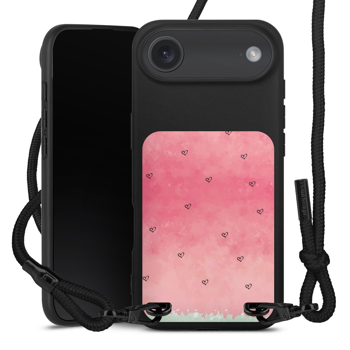 Pure Black: Handyhülle, Stoffband und Metalldetails in stylischem Mattschwarz.