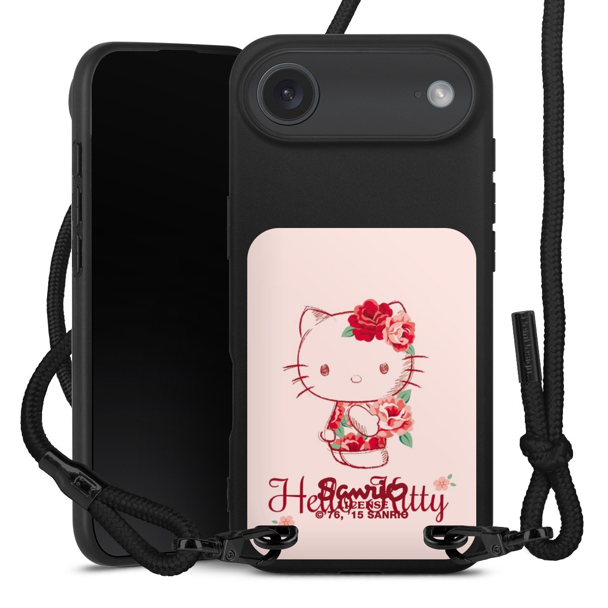 Pure Black: Handyhülle, Stoffband und Metalldetails in stylischem Mattschwarz.
