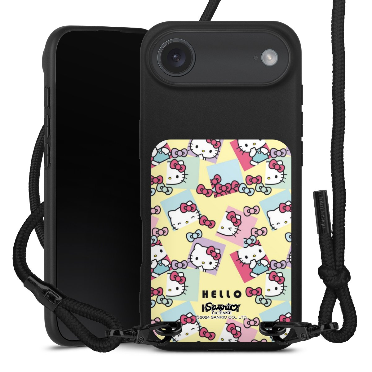 Pure Black: Handyhülle, Stoffband und Metalldetails in stylischem Mattschwarz.