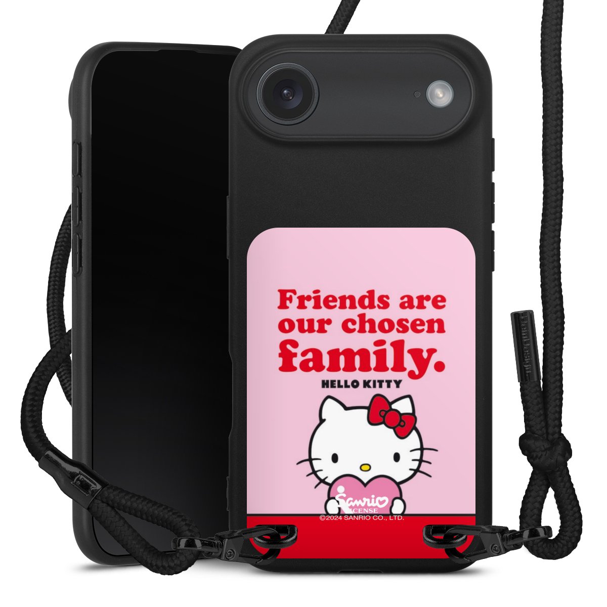 Pure Black: Handyhülle, Stoffband und Metalldetails in stylischem Mattschwarz.