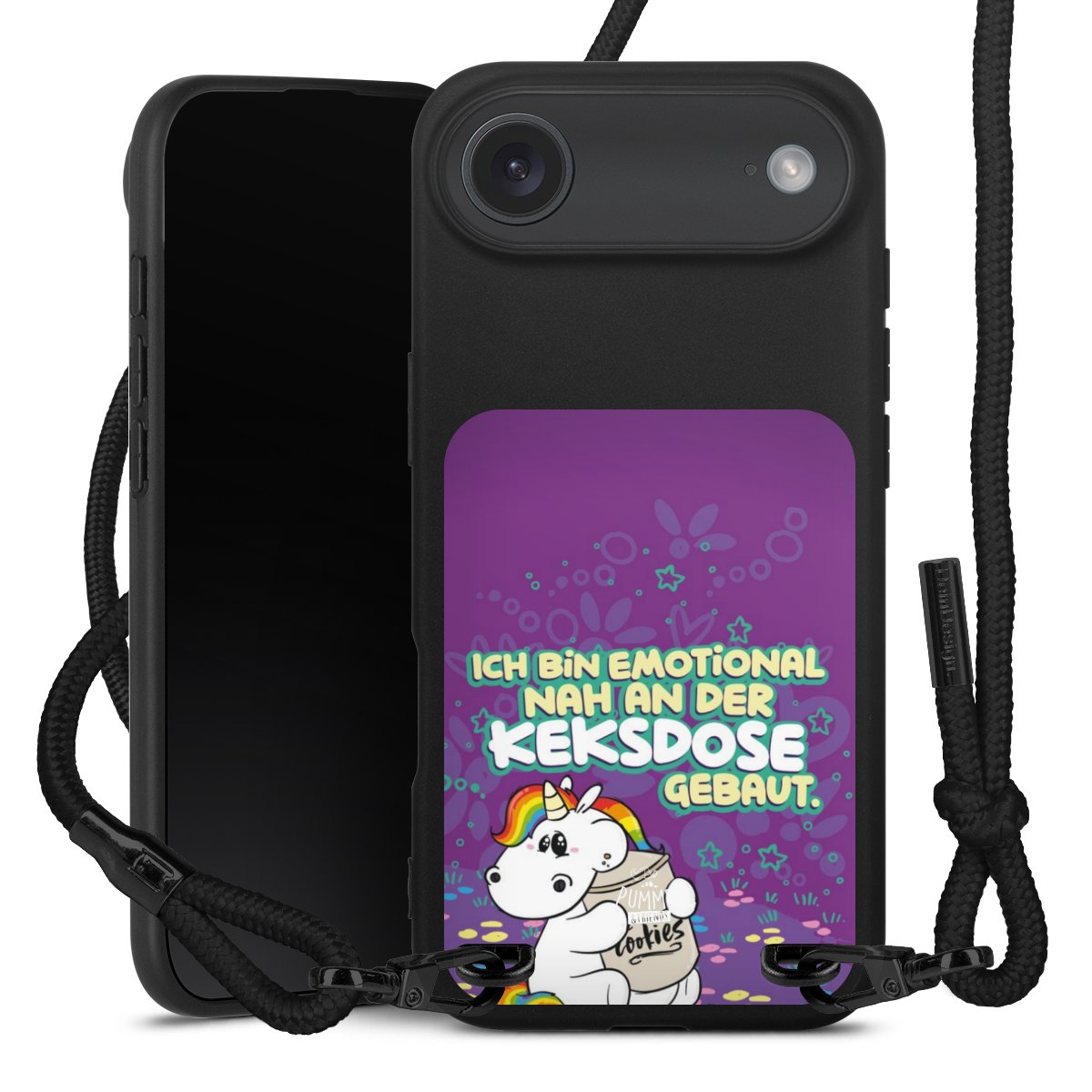 Pure Black: Handyhülle, Stoffband und Metalldetails in stylischem Mattschwarz.