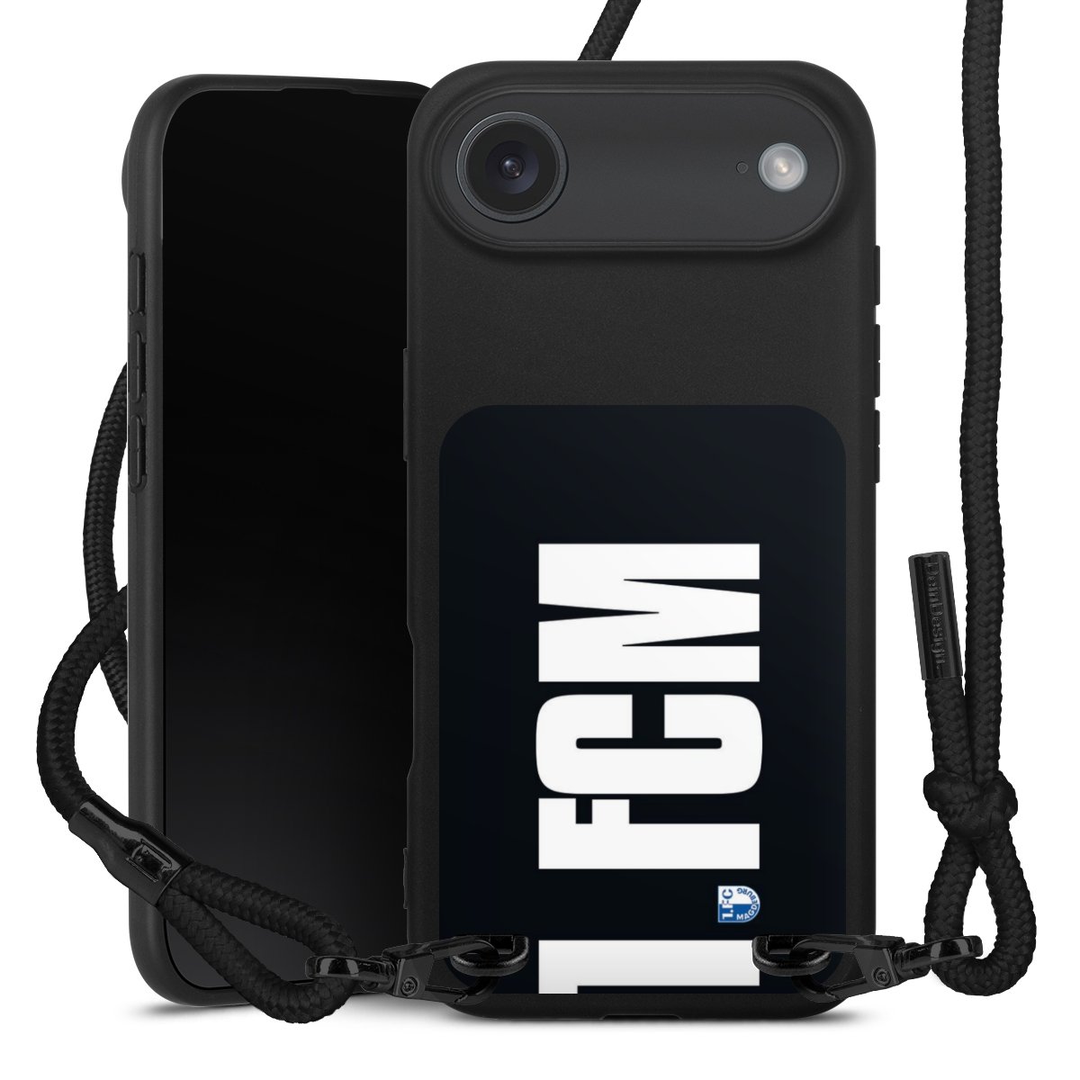 Pure Black: Handyhülle, Stoffband und Metalldetails in stylischem Mattschwarz.