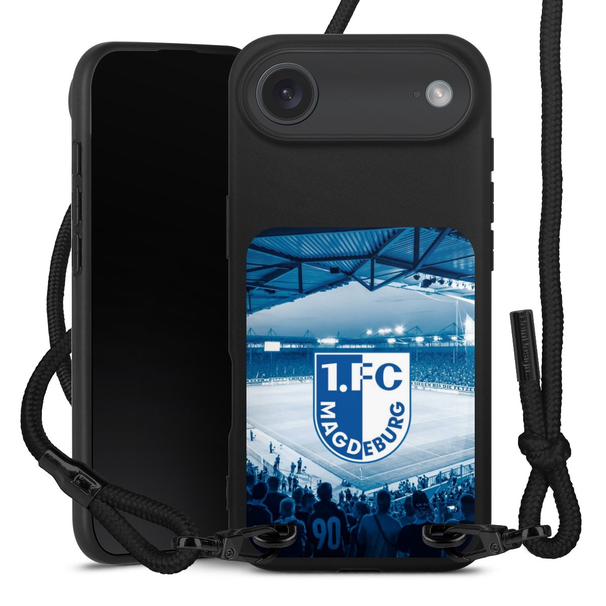 Pure Black: Handyhülle, Stoffband und Metalldetails in stylischem Mattschwarz.