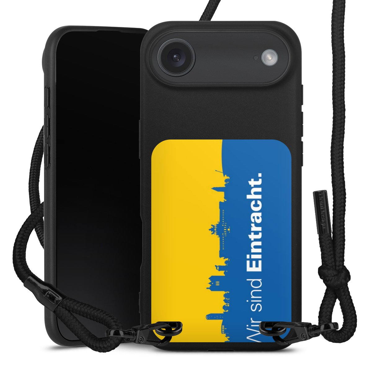 Pure Black: Handyhülle, Stoffband und Metalldetails in stylischem Mattschwarz.