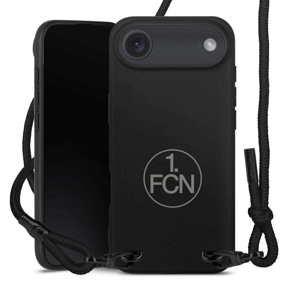 Pure Black: Handyhülle, Stoffband und Metalldetails in stylischem Mattschwarz.