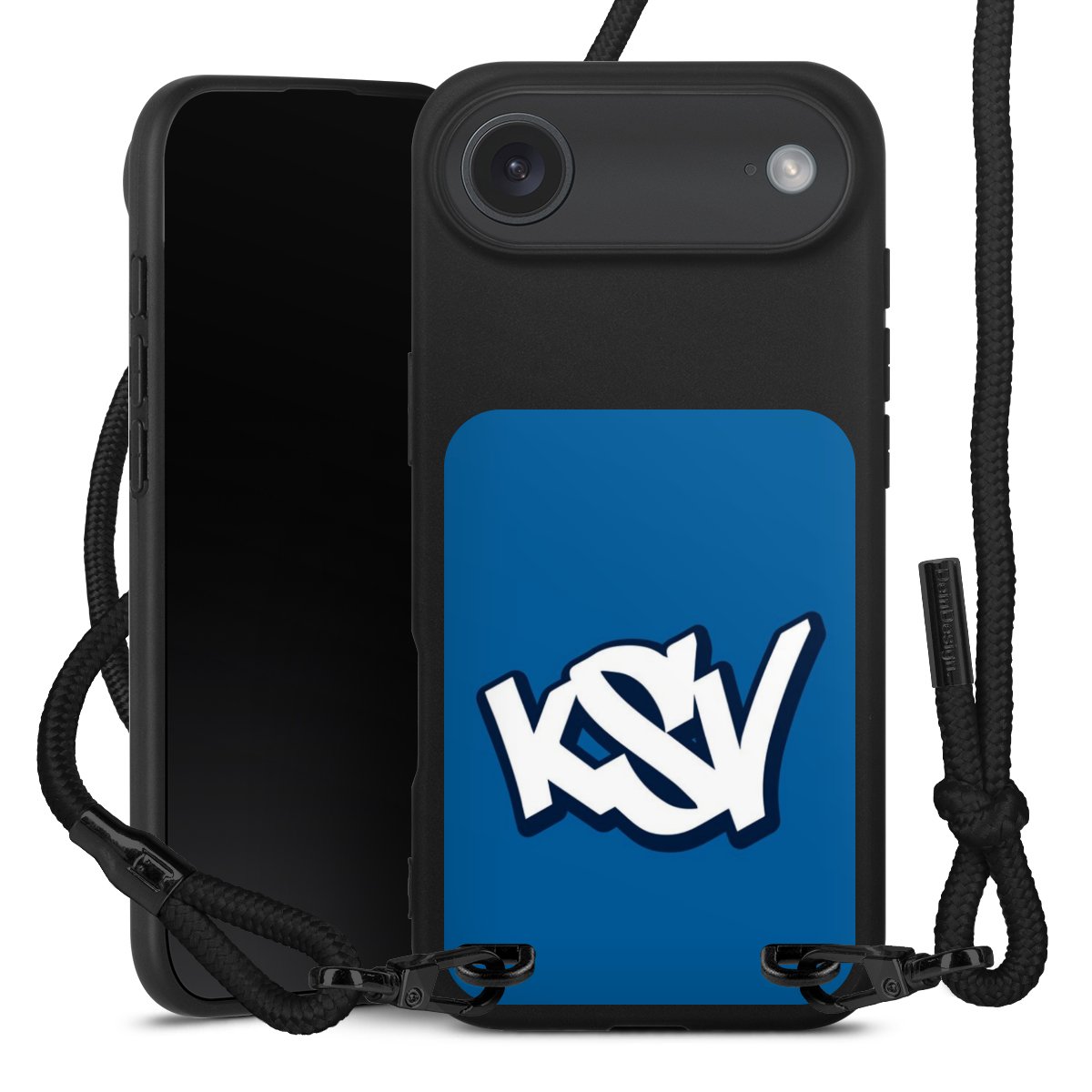 Pure Black: Handyhülle, Stoffband und Metalldetails in stylischem Mattschwarz.